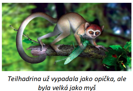 Jestliže naši první primáti byli malí, tak jejich další vývojové druhy byli ještě menší. Třeba o deset milionů let později tato Teilhadrina. Tu již lze dokonce nazvat jako "takovou malou opičku". Byla velká asi jako myš a vážila kolem 50 gramů. Žila převážně na stromech a opět většinou v noci, měla velké oči, ale byla pravděpodobně barvoslepá.