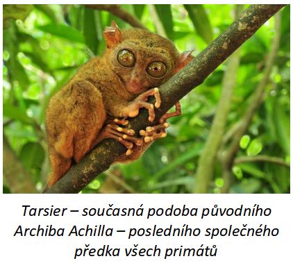 My tedy patříme mezi úzkonosé – Catarhini. A s námi tam patří ještě kočkodani. Také se vyvíjíme, a to dost překotným způsobem. Toto je Archíbus Achilles, který se našel rovněž ještě v Číně z doby před asi 50 miliony let. A byl to opravdu prcek velký ani ne sedm centimetrů a vážil 20–30 gramů. Kdyby tehdy ještě žil Tyranosaurus, tak by byl velký jako jeho zub. Živil se kořínky a neustále se pohyboval, aby si udržel tělesnou teplotu. A byl to již poslední společný předek všech primátů. Pak se začali opět dělit.