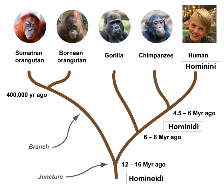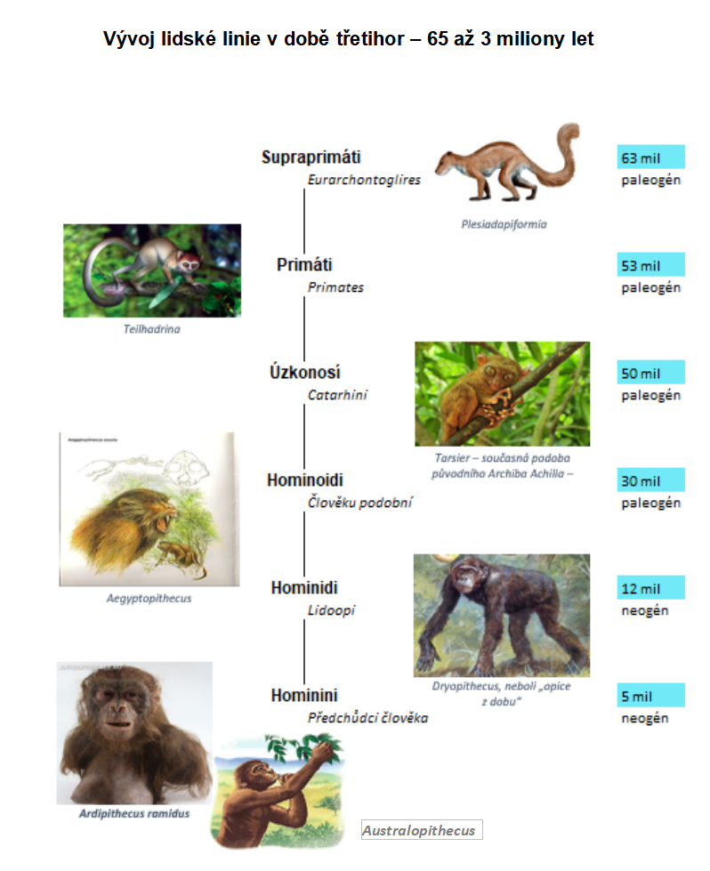 Z primátů se oddělují letuchy a tany a z nás se již stávají hominoidé, přeloženoněco jako"člověku podobní". Spolu s námi se vyvíjejí další hominoidní linie, které se od nás postupně oddělují a dnes jsou z nich samostatné druhy. Giboni, orangutani, gorily a konečně šimpanzi.