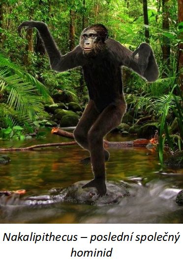 Směrem k naší lidské linii jsou dále zmiňováni další vývojové druhy jako Pierolapithecus (11 milionu let) ze Španělska anebo Ouranopithecus (10 milionu let) z Řecka a Turecka, ale asi posledním společným předkem všech hominidů – lidoopů, neboli lidí, šimpanzů a goril je pravděpodobně Nakalipithecus. Je dosud málo známý, našli ho teprve v roce 2007, ale asi o něm ještě v budoucnu uslyšíme častěji. Je starý něco přes 9 milionů let a již je poměrně velký – asi 110 cm na výšku a váha plus minus 90 kg. Podle silné vrstvy skloviny na jeho zubech se usuzuje, že krom ovoce již zvládal i tužší a tvrdší potravu jako semena a ořechy, a tedy že se již převážně mohl zdržovat na zemi.