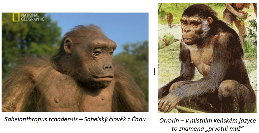 Jejich společnými předky jsou Sahelanthropus a o něco mladší Orrorin. Jeden pobýval před sedmi miliony let v Čadu a druhý o něco málo později v Keni. Oba byli asi tak 120 cm vysocí, s váhou kolem 45 kg. Oba sice již mohli chodit po dvou, ale stále se raději drželi ve větvích stromů. A jsou to asi již i poslední společní předkové lidí a šimpanzů.