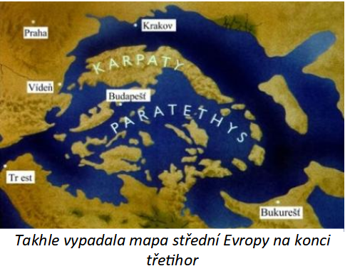 Naše oblast je stále převážně pod vodami oceánu Tethys, ale jak se zmenšuje prostor mezi Afrikou a Evropou, stane se z něj postupně dnešní Středozemní a Černé moře. Současně se pomalinku ochlazuje, a tím klesá hladina moří a postupně se odkrývají další části pevnin. Tak je to i na našem území, kdy se brzy již definitivně dostáváme nad povrch. Jako poslední se jako pevnina u nás objevuje jižní Morava někdy na konci tohoto období – asi před 25 miliony let.