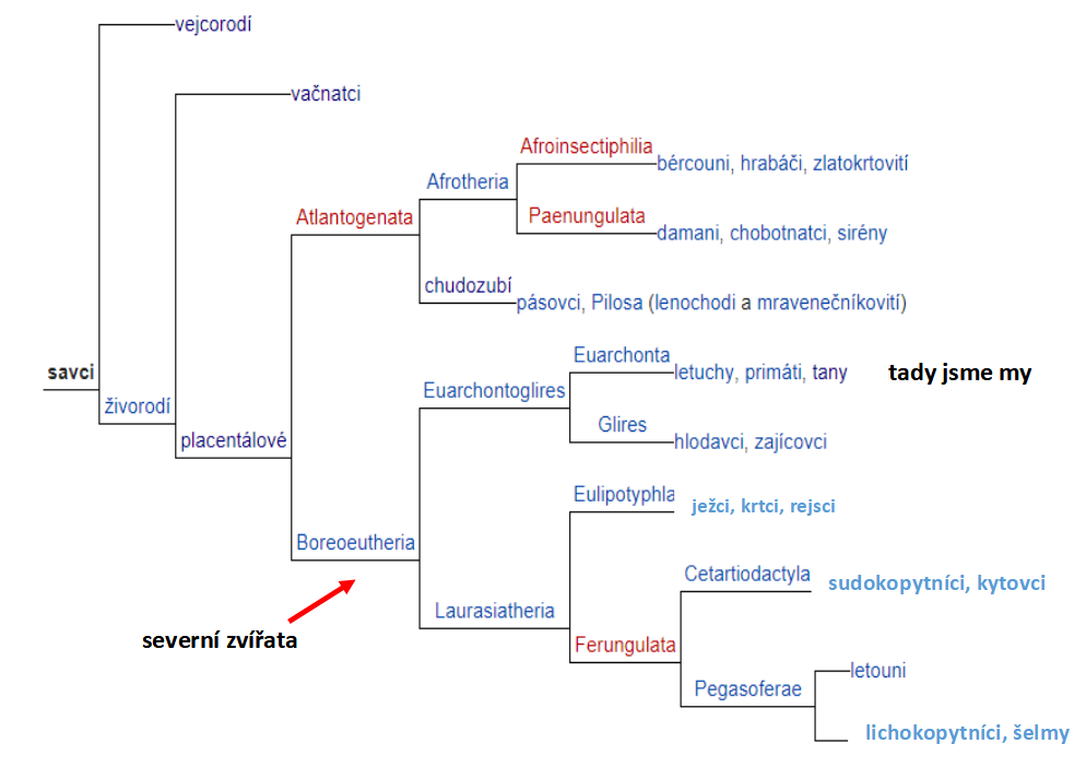 Nu, a naše větev "severních zvířat "– Boreoeutheria. I ta se rozděluje a trochu nám to opět přiblíží malé schémátko.