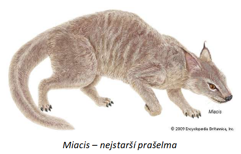 Kdo ale už šelmou skutečně je, je tento Miacis. Nejstarší masožravý savec a nejstarší společný předek všech nejen šelem, ale možná i kopytnatců. Vyvinul se krátce po vymření dinosaurů asi tak před 62 miliony lety. Nebyl nijak veliký, asi jako dnešní lasička, ale živil se drobnými zvířaty – ještěrkami, ptáky a drobnými savci.