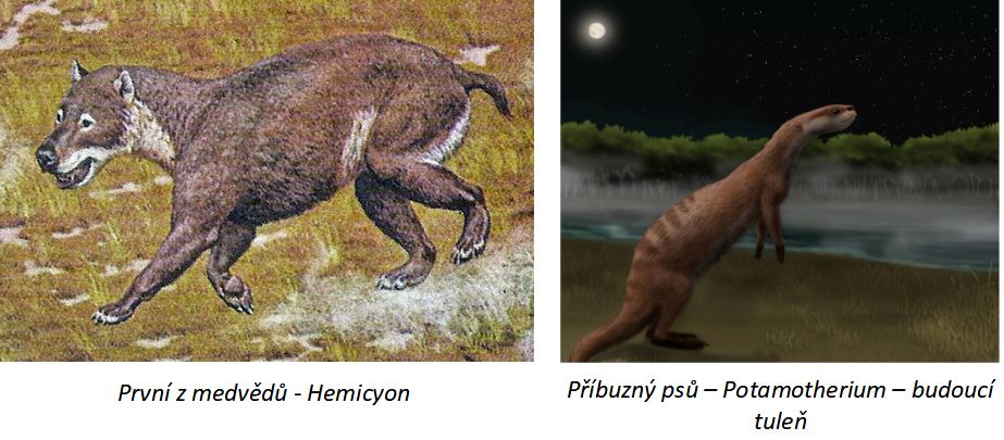 Tak tohleto je třeba první předchůdce všech tuleňů, mrožů a lachtanů. Vyvinul se před 55 miliony let a i když přímo nežil ve vodě, plavat uměl velmi dobře. Jmenuje se Potamotherium a tak trochu se podobal dnešní vydře. Byl asi 1,5 metru dlouhý, měl dobrý sluch i zrak, ale zato velice špatný čich.