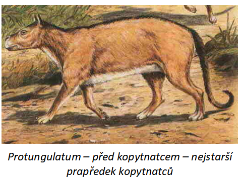 A taky už tu byli předchůdci kopytnatců. Nejstarším dosud nalezeným je Protungulatum, což je po česky "před kopytnatcem". Prý byli jakýmsi podivným evolučním experimentem. Šlo zpravidla o dravé kopytnatce, jejichž nejbližšími příbuznými jsou koně, velbloudi, hroši nebo třeba prasata. Jemu podobných druhů ale bylo více a byla mezi nimi i řada hmyzožravců i býložravců. Konkrétně tento druh žil v severní Americe.