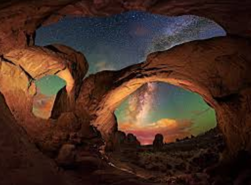 Mléčná dráha nad pobřežím v Chile (vlevo) a pak ještě v Utahu. A právě zde musí být pohled na Mléčnou dráhu fascinující. Tady jako by se prolínaly dva výtvory věčnosti času. Nahoře miliardami let vytvořená vesmírná brána a tady u nás na Zemi, miliony let působící počasí, eroze a dravá voda vymodelovaly úžasný svět skalních masívů, všemožných oblouků a hlubokých kaňonů.