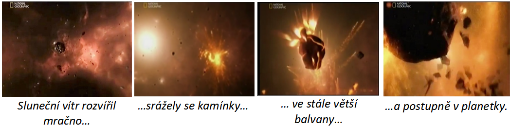 A tak se to tam dalších 200 milionů let pořád sráželo a spojovalo, až konečně vznikly různé planety o velikostech, jak je známe dnes. Dál od Slunce, kam sluneční vítr odvál již jen lehčí plyny, se tyto plyny shromáždily kolem nějakého nahodilého kamenného jádra, postupně se na něj nabalily a vytvořily se tak obrovské plynové koule – plynové planety.