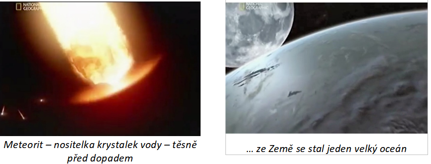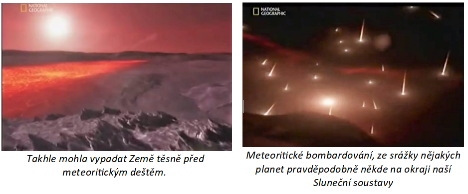 Ale pak před asi 3,9 miliardami let se někde v naší Sluneční soustavě srazily nějaké planety. Meteority a další úlomky z této srážky začaly dopadat na naši Zemi a bombardovaly je celých 20 milionů let. Říká se tomu meteoritický déšť nebo také rej. A právě tyto meteority z této doby mají asi největší vliv na budoucím vývoji naší planety. Obsahovaly totiž malá zrnka zmrzlé vody.
