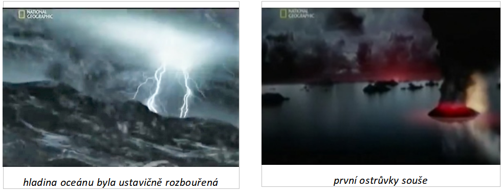 Moře je tedy opět klidné, ale uvnitř země to vře. Je tam žhavé jádro, vysoké tlaky a ty tlačí lávu na povrch. Různými štěrbinami v zemské kůře vyvěrá na povrch a vytváří tak spoustu větších i menších sopek. Na povrchu žhavá láva chládne a vznikají tak první ostrůvky pevniny. Ty se postupně zvětšují, slévají se dohromady a vytváří se první souše – ostrovy.
