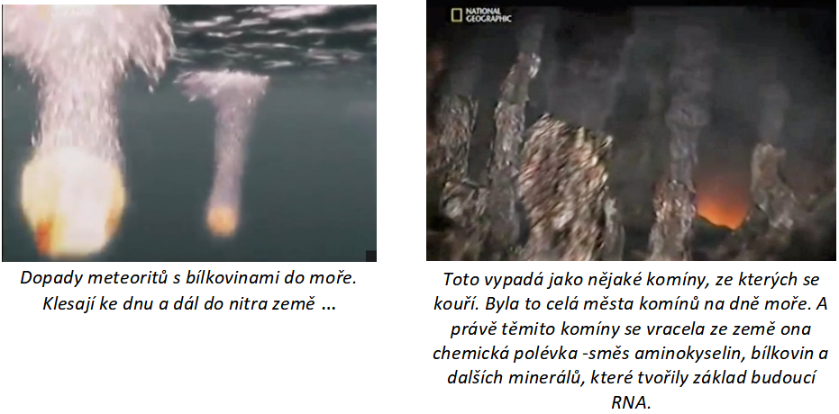 A teď přichází další milník ve vývoji Země. Na planetu dopadá opět meteoritický déšť. Tentokrát sebou přináší různé aminokyseliny, bílkoviny a další minerály. Klesají na mořské dno, kde je tma a teplota se blíží k bodu mrazu. Puklinami v zemské kůře pronikají dál do nitra země. Tam se zase zahřívají a vrací se na povrch. Cestou sebou strhávají další minerály a jiné látky, které byly uloženy v nitru země a v moři tak vzniká jakási "chemická polévka".
