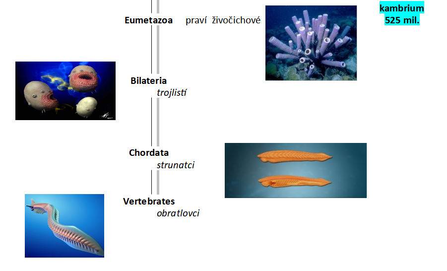 Nás však nejvíc zajímají strunatci. Z těch se později vyvinuli první obratlovci. Ryby, plazi, ptáci, savci...