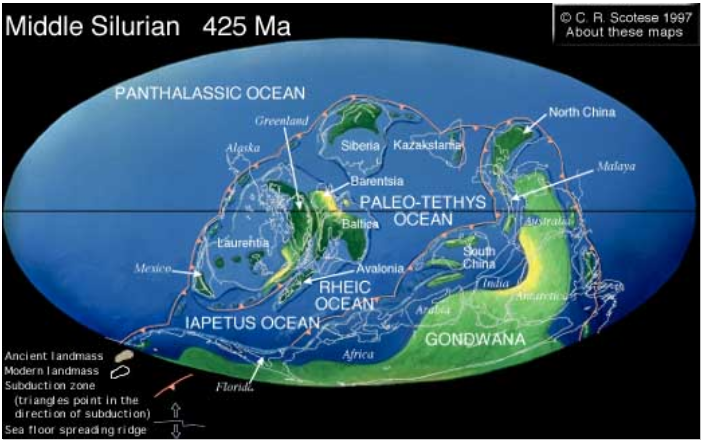 Na této mapce je již vidět, že se to na souši už začíná zelenat. Díky začínající ozónové vrstvě se rostlinám daří udržet mimo oceány a pomalu se rozšiřují po všech kontinentech. Jsou to cévnaté rostliny, které se ještě chrání před zářením silnou pokožkou s průduchy na "dýchání". Dokonce se již objevují i první suchozemské houby.