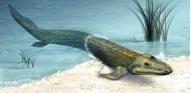 A pak přichází Tiktaalik. Asi tak před 375 miliony let. Nejprve opatrně vystrkuje hlavu nad hladinu, pak stále častěji, až se u něj začne formovat krk a může otáčet hlavou nezávisle na trupu. Je to ale ještě pořád ryba, i když už má mnohem blíž ke čtyřnožcům. Dorůstal délky od jednoho do tří metrů a žil v pobřežních mělčinách. Dýchal plícemi i žábrami.