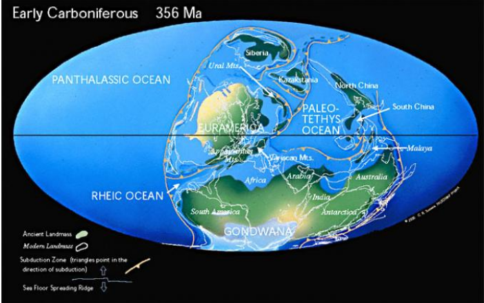 Pokrytí rostlinami je již hodně rozsáhlé a na mapce to jsou ty tmavě zelená místa. Ale ty stromy a další rostliny po čase uhynou, jejich zbytky se postupně hromadí, vrství se na sebe a zejména v močálovitých oblastech, kde je častý výkyv hladiny vody, jsou zanášeny sedimenty. Vytváří se obrovské plochy s vysokými vrstvami tlejícího materiálu, který postupně uhelnatí a právě v této době vznikají budoucí uhelná ložiska.