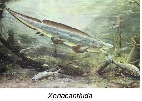 Z fauny je stále nejvíce druhů v mořích. Mnohé druhy zanikly, jiné vznikají. Zejména se rozmáhají žraloci, jako např. tento druh Xenacanthida, který dosahoval až čtyřmetrové délky. U nás žil v jezerech a řekách jeho menší druh se sedmdesáti centimetry.