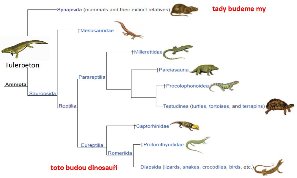 A tady se to opět větví. Jedna větev vede k nám – savcům – a ta se jmenuje synapsida. A druhá je nazývána sauropsida, a ta vede k ještěrům, ptákům anebo taky ke krokodýlům. Patří mezi ně i ti populární dinosauři a ptakoještěři. A rozvoj tady těch všech začne již za chvíli…