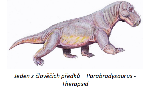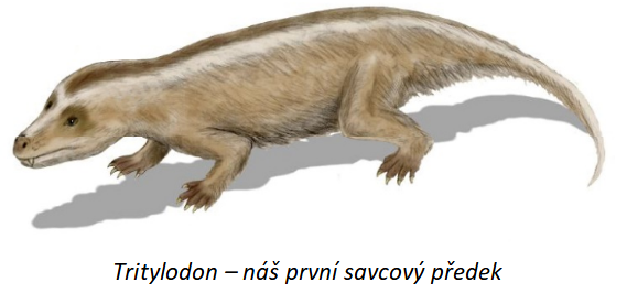 Samozřejmě, nejvíc na to doplatily ty největší druhy. A na souši to byli v té době právě naši savcovití plazi. Přežily z nich pouze tři nejmenší druhy. Toto je jeden z nich, Tritylodon – trojzubý – asi 30 cm dlouhý, budoucí savec. Dobře se na něj podívejte, ten nás zachránil.