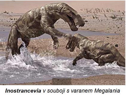 A koho už bych vůbec nechtěl poznat, tak to je tento Inostrancevia z čeledi Gorgonopsia. No posuďte sami. Byl to jeden z největších Therapsidů a dosahoval délky až čtyř metrů. A byl to pořádný dravec a taky už měl hodně znaků dnešních savců. Byl teplokrevný a měl srst. Jeho špičáky byly dlouhé až 15 cm a dokázal otevřít tlamu do pravého úhlu. Vážil až 500 kg.