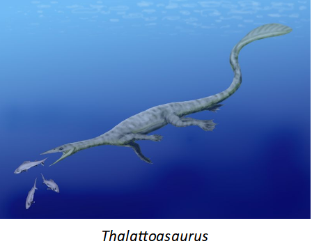 Ale byly tu i vodní druhy. Třeba Thalattosaurus, neboli "Ještěřice oceánu". Ta se objevila až v závěru období, ale byla až přes čtyři metry dlouhá, a to včetně dlouhého placatého ocasu, který používala jako pohon.