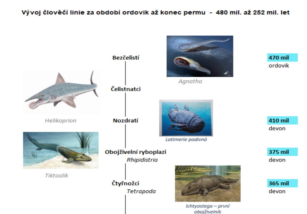 Ale pozor. Těch ryb už zde je spousta druhů a jsou mezi nimi i tzv. nozdratí. A toto je právě ten druh, od kterého již můžeme vystopovat alespoň přibližnou vývojovou řadu, vedoucí k budoucím obojživelníkům, plazům a k nám - savcům.
