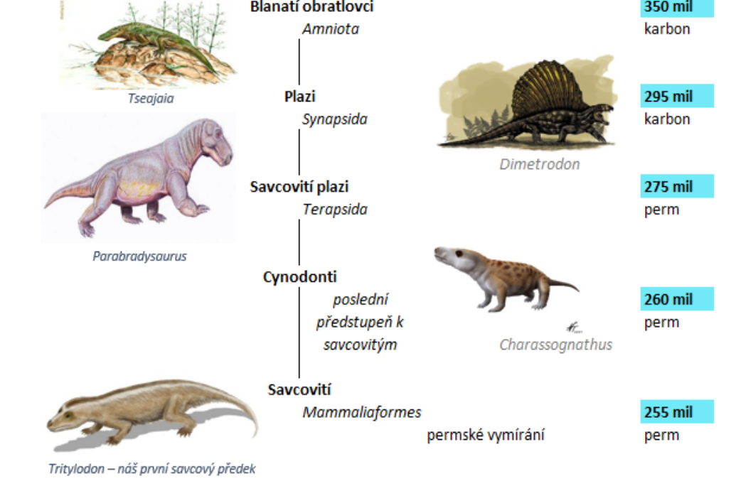 Brzy se však začaly oddělovat dvě větve. Jedna vedoucí k nám savcům – synapsida, což si osobně překládám jako "savcovití", a druhá – sauropsida, po svém přeloženo jako "ještěrovití", což povede k dinosaurům, ptákům a krokodýlům. Obě cesty ale budou ještě hodně dlouhé.